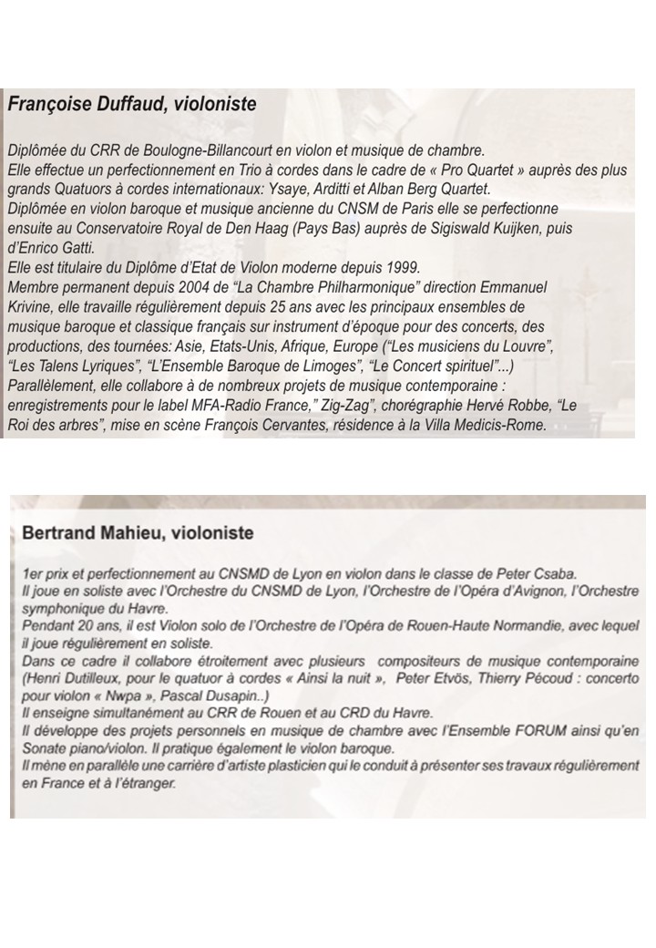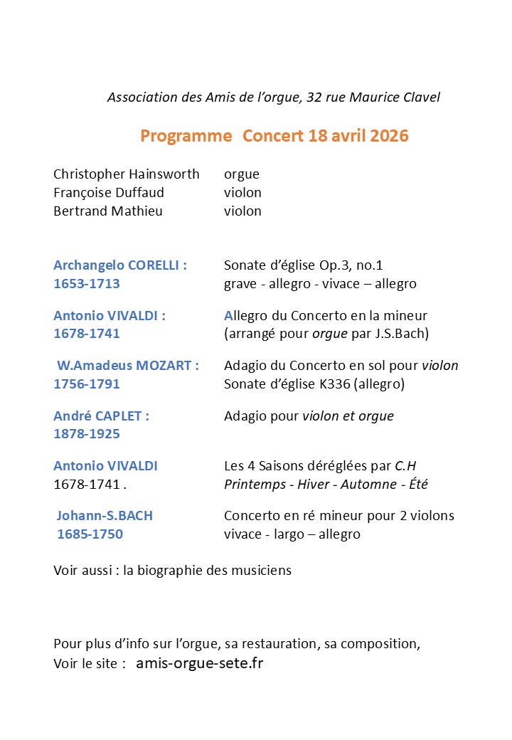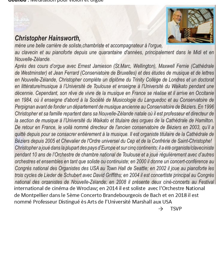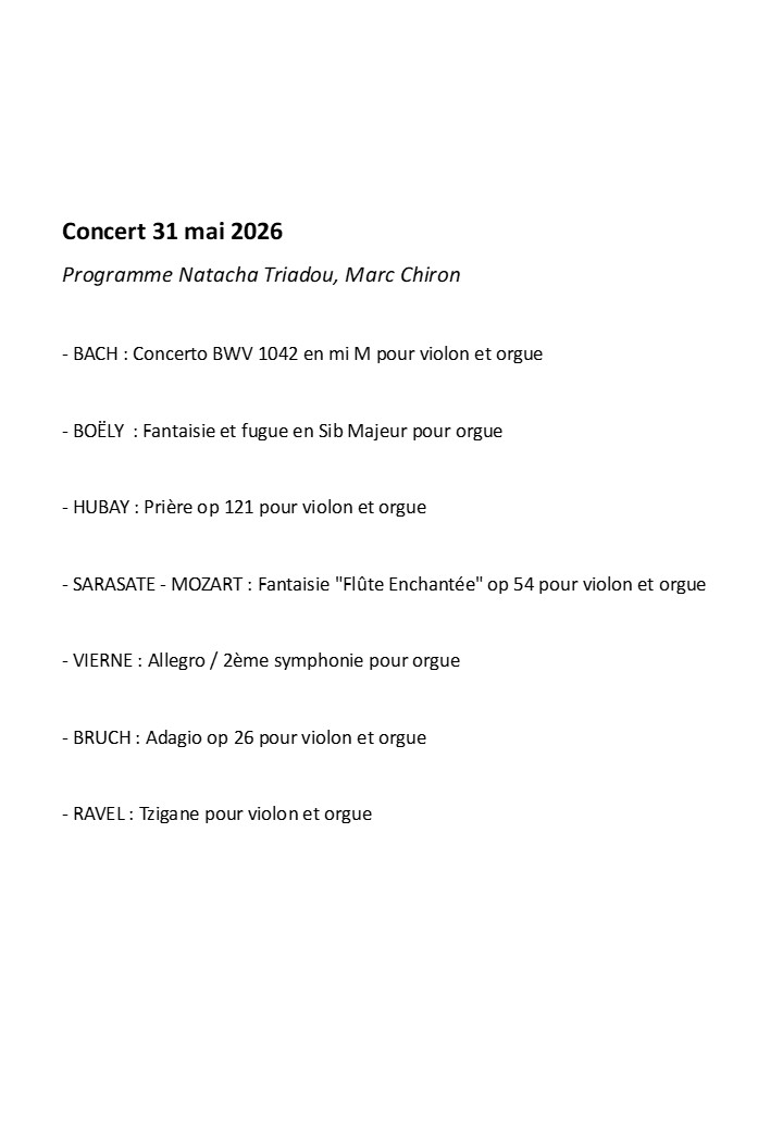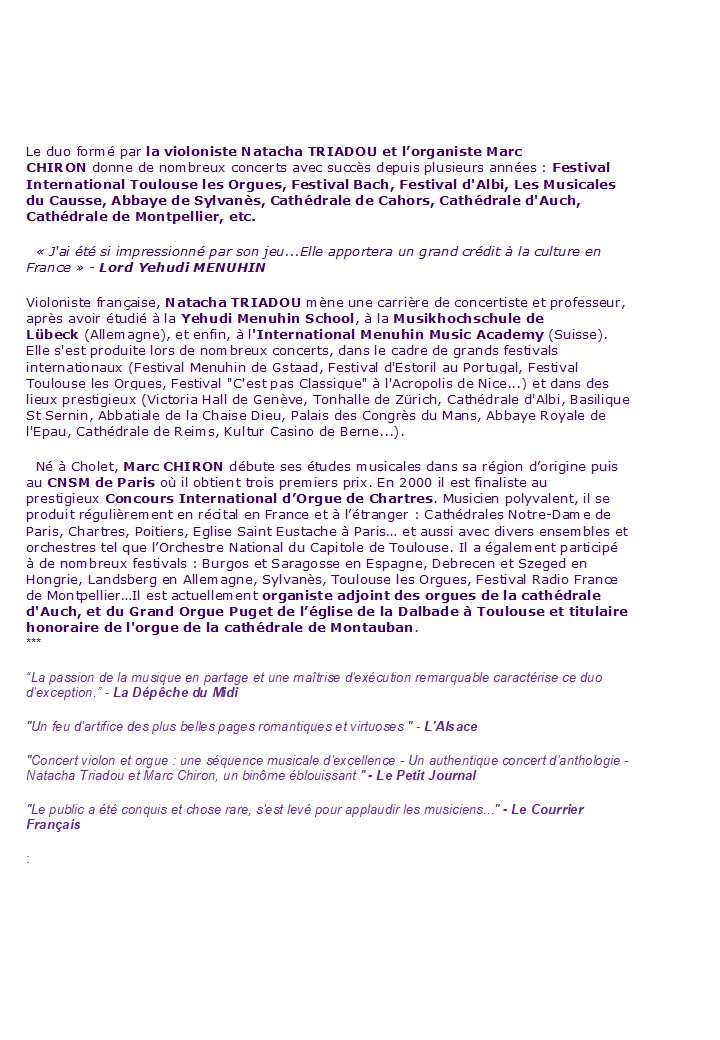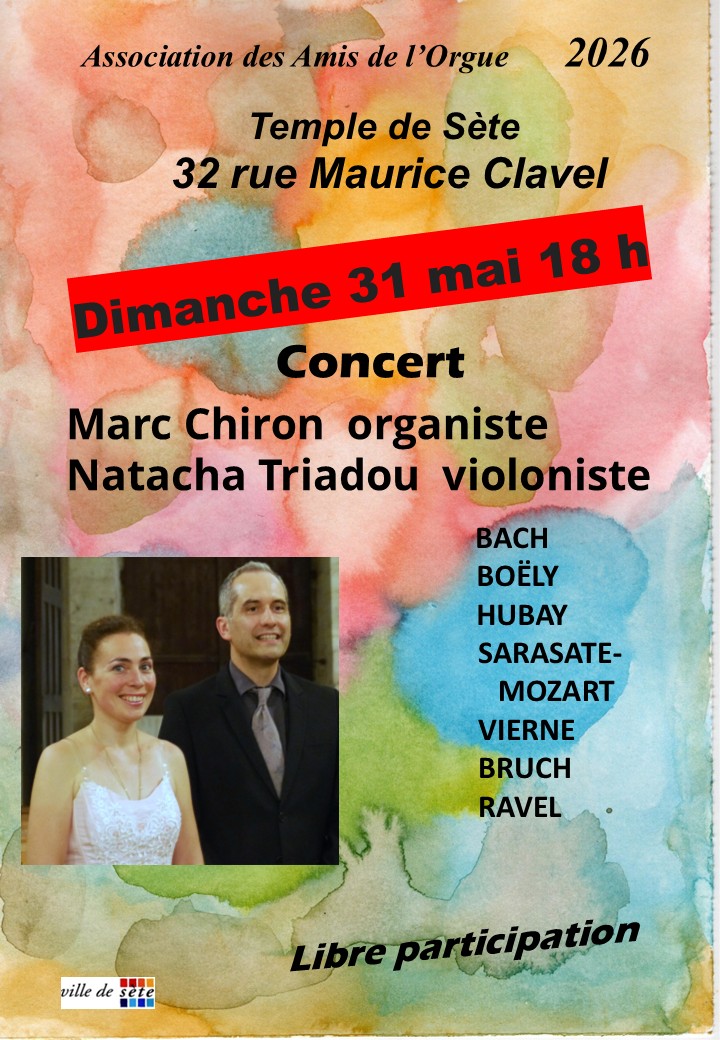 - En décembre, de 12h à 12h30 : Noëls variés du XVIII siècle. - Samedi 21 septembre, de 17 h à 19 h. Portes Ouvertes. Pour la Journée Européenne du Patrimoine, l'orgue joue! Pièces divertissantes. Le thème retenu en 2019 est "arts et divertissements". - Dimanche 2 juin à 18h Concert Orgue et Violon, avec l'organiste concertiste Marc CHIRON, titulaire du Grand Orgue de la Cathédrale de Montauban, cotitulaire de la Cathédrale d'Auch, nombreux prix, et la violoniste concertiste Natacha TRIADOU, qui a travaillé avec de grands Maitres, comme Lord Yehudi Menuhin, Alberto Lysy, Zachar Bron, Gérard Poulet. - Arcangelo CORELLI (1653-1713) La Follia - Béla BARTOK (1881-1945) Danses Roumaines - Tomaso Antonio VITALI (1663-1745) Chaconne - Felix MENDELSSOHN (1809-1847) « Allegro », extrait de la sonate n°3 pour orgue - Piotr Ilitch TCHAIKOVSKI (1840-1893) Sérénade Mélancolique - Pablo de SARASATE (1844-1908) Airs Bohémiens - Eugène GIGOUT (1844-1925) Toccata pour orgue - Joseph ACHRON (1886-1943) Mélodie Hébraïque - Jozef WIENIAWSKI (1837-1912) Carnaval Russe Concert ouvert au public avec libre participation. Biographie des musiciens Natacha Triadou, violoniste “J’ai été si impressionné par son jeu... Elle apportera un grand crédit à la culture en France” Lord Yehudi MENUHIN. Le talent exceptionnel de Natacha TRIADOU a été reconnu par les plus grands maîtres du violon. Après sa découverte de l'instrument à l'âge de 4 ans, ses premiers contacts avec le public deux ans plus tard, sa formation se poursuit au Conservatoire de Toulouse où elle obtient, à 12 ans, le 1er Prix de solfège et l'année suivante la Médaille d'Or de violon. Puis, suite à sa participation au Festival « Pablo Casals » de Prades, elle bénéficie des conseils de Gérard POULET, et donne sa première prestation télévisée à la Halle aux Grains de Toulouse. Sa rencontre avec Lord Yehudi MENUHIN est déterminante : impressionné par son jeu, il lui demande de venir étudier dans son école en Angleterre. Elle y enrichit son art grâce à ses conseils et à ceux d’autres grands maîtres de la scène musicale internationale, se produit très souvent en concert et jouera sous sa direction au Queen Elisabeth Hall de Londres. A l’issue de cette formation prestigieuse, elle étudie avec Petru MUNTEANU et Maria EGELHOF à la Musikhochschule de Lübeck en Allemagne. Parallèlement, elle participe aux Master-classes de Zachar BRON dans le cadre du Schleswig- Holstein Musik Festival. Enfin, elle rencontre Alberto LYSY qui l’invite à l’International Menuhin Music Academy (IMMA - Gstaad) en Suisse, où elle reçoit son enseignement ainsi q u e celui de Jeremy MENUHIN et d'autres grands artistes. Natacha TRIADOU s'est produite lors de nombreux concerts et ournées, en France comme à l’étranger : elle a participé à des festivals internationaux et joué dans des salles prestigieuses telles que le Victoria Hall de Genève, la Cathédrale de Rouen, le Paul Klee Zentrum de Berne, la Basilique Saint Sernin de Toulouse, l’Abbaye Royale de l’Epau, l’Abbatiale de la Chaise Dieu, la Tonhalle de Zürich, le Palais des Congrès du Mans, la Cathédrale de Reims, la Halle aux Grains de Toulouse, le Mont Saint Michel, l’Acropolis de Nice etc. Son sens musical et sa virtuosité lui permettent d'aborder tous les répertoires et c'est ainsi qu' elle a donné de nombreux concerts en solo, en formation, avec piano ou orgue. Elle a joué les grands concertos (BRAHMS, BEETHOVEN, PAGANINI n°1...) accompagnée de divers orchestres parmi lesquels le Chamber Orchestra of London, le Tübinger Kammermusikkreis, l’Orchestre Philharmonique Européen, la Camerata Lysy, l'Ensemble Orchestral de Toulouse, la Camerata Menuhin ou l’Orchestre Philharmonia Tolosa, etc., et créé, le Concerto pour violon « Madness and Salvation » d'Adrien CASSEL avec l’Orchestre Philharmonique au Théâtre de Fontainebleau. (plus d'infos: www.natachatriadou.com - contact.natachatriadou@gmail.com) Marc CHIRON, organiste 3 premiers prix et D.F.S. du CNSM de Paris, Finaliste du Concours de Chartres 2000, Premier Prix d'Accompagnement Piano au CNR de Toulouse, Diplôme d'Etat d'Orgue, Titulaire du Grand Orgue de la Cathédrale de Montauban, Soliste et Continuiste au sein d'Orchestres et d'Ensembles, Professeur d'Orgue et Pianiste Accompagnateur, Organiste co-titulaire des orgues de la Cathédrale d'Auch. Marc Chiron commence ses études musicales dans sa ville natale. Il les termine au Conservatoire National Supérieur de Paris en obtenant 3 premiers prix. Ses concerts l'emmènent dans les principales Cathédrales de France: Notre-Dame de Paris, Chartres, Poitiers, Bordeaux, Béziers... Il joue plusieurs fois en soliste le Concerto de Poulenc avec l'Orchestre National du Capitole de Toulouse. Il participe à différents festivals en Europe (France, Allemagne, Espagne, Hongrie). Il se produit régulièrement avec la soprano Anne-Laure Touya et le trompettiste Patrick Pagès avec qui il fonde l'ensemble Eufonia, la soprano Béatrice Buiron, le contre-ténor Guillaume Delpech, l'ensemble Les chantres de St Hilaire ou encore le choeur Henri Duparc de Tarbes... - Dimanche 12 mai de 17 h à 19 h A l’occasion du Jour de l’orgue, initié par Orgue en France et soutenu par le ministère de la Culture, nous organisons des auditions de notre orgue Puget-Merklin. Portes ouvertes, entrée libre. Un programme musical, avec présentation de l'Orgue et de ses possibilités, réponses à vos questions, dans un lieu architecturé à la belle acoustique. Nous entendrons des pièces d’orgue variées, produites par nos 1200 tuyaux. En musique sacrée ou profane! - Dimanche 28 avril à partir de 11 h 30 Assemblée Générale des membres de l'association des Amis de l'Orgue EPU SBT de Sète, au temple. - Les dimanches 7 avril et 14 avril, de 10 h à 10 h 30 ou de 11 h 45 à 12 h 15 Auditions de pièces d'orgue créées aux siècles pr