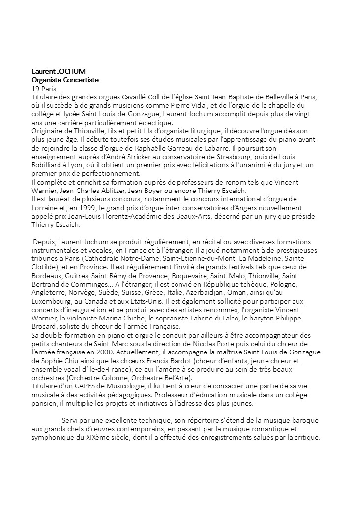 le 01/07/2012 concert Orgue et flûte Hartmut KEDING orgue Hartmut Keding musicien d'Eglise ( Kantor) à Hambourg et depuis 1991 à Frankfurt/Main concerts comme chef d'orchestre et de chorale, organiste, pianiste et claveciniste. Christa KEDING flûte Christa Keding, enseignement aux écoles de musique de Essen, Hambourg et Frankfurt/M. concerts comme flûtiste d'orchestre, soliste et musique de chambre. OEUVRES de : Bach, Mozart, Mendelssohn,Franck,Reger, Fauré, Inghelbrecht, Jardanyi … *** Programme • Felix Mendelssohn Bartholdy Prélude en Sol majeur Op.37 n°2 (1809-1847) pour orgue • Pál Járdányi Sonatine pour flûte et orgue (1920-1966) Allegro moderato – Adagio molto un poco rubato – Allegro con brio. • Gabriel Fauré Pièce pour flûte et orgue (1854-1924) • Friedrich Kuhlau Capricio op.10 pour flûte (1786-1832) • Georg Philipp Telemann Sonate en fa mineur pour flûte et orgue (1681-1767) Triste – Allegro – Andante – Vivace. • Max Reger Mélodie en Si bémol majeur Op.129,4 (1873-1916) pour orgue • Wolfgang Amadeus Mozart Andante en Ut majeur KV 315 (1756-1791) pour flûte et orgue • Désiré Émile Inghelbrecht Esquisses antiques pour flûte et orgue (1880-1965) Scaphé – Driades • Johann Sebastian Bach Fantaisie Sol majeur BWV 572 pour orgue (1685-1750) Très vivement – Gravement – Lentement - le 17/06/2012 concert d'orgue organiste Frédéric Muñoz thème : "airs connus et improvisations ..." Improvisation : Ouverture à la Française "alla Rameau" G.F. Händel :Célèbre Largo de l'opéra "Xerxès" J.S. Bach Toccata en ré majeur, improvisation sur la toccata Improvisation sur le Choral "Comme on oyt le cerf bruire" C. Saint Saëns: Tollite Hostias F. Chapelet : Choral "Christ lag in Tosbanden", Improvisation Anonyme Anglais : "My lady carey's dompe" Improvisation sur l'Alléluia de G.F.Händel Noëls en tambourins Mini-symphonie improvisée Introduction, Scherzo, Adagio, Final.