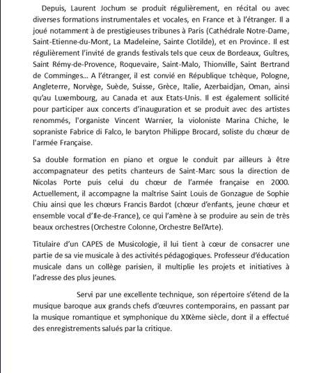 Né en 1989, David Cassan débute ses études musicales aux conservatoires de Caen (classe d’Erwan Le Prado), d’Issy-les-Moulineaux ainsi qu’à l’école de musique de Saint-Germain-en-Laye. Il a obtenu un premier prix d’improvisation à l’orgue dans la classe de Pierre Pincemaille au conservatoire de Saint-Maur-des-Fossés.David Cassan poursuit ses études auprès de Thierry Escaich, Cyril Lehn, Pierre Pincemaille, Alain Mabit, Olivier Trachier, Philippe Lefebvre, Laszlo Fassang, Louis-Marie Vigne François Espinasse, Liesbeth Schlumberger et Jean-François Zygel aux Conservatoires Nationaux Supérieurs de Musique de Paris et de Lyon où il a obtenu les prix d’orgue, d’improvisation, d’harmonie, de contrepoint, de polyphonie Renaissance, de fugue et forme, écriture XXème siècle et de chant grégorien. Il est aussi titulaire d’une licence de musicologie obtenue à l’université de la Sorbonne Paris IV.Au cours de diverses masters classes, David Cassan a bénéficié de l’enseignement de nombreux grands noms de l’orgue, tels qu’Olivier Latry, Jean-Pierre Leguay, Lorenzo Ghielmi, Henry-Franck Beaupérin, Marie-Louise Langlais, Lynne Davis, Jean Guillou…En 2011, il devient l’organiste du Chœur Symphonique de Paris.Il développe aujourd’hui une carrière de soliste et d’accompagnateur qui l’a amené à se produire en compagnie d’ensembles et d’artistes de renom (Didier Sandre, Jean-Loup Chrétien, Orchestre National de Lyon, Capitole de Toulouse, Quatuor Girard, Romain Leleu…) et ce dans de nombreux lieux en France et à l’étranger (Allemagne, Angleterre, Espagne, Uruguay, Pays-Bas, Irlande, Luxembourg, Belgique, Italie, Suisse…). Passionné de cinéma muet, David Cassan se produit également lors de ciné-concerts aussi bien dans des églises à l’orgue que dans des cinémas prestigieux au piano (Cinémathèque de Paris, Auditorium de Lyon, Le Balzac, Fondation Pathé Jérôme Seydoux, Forum des images…). Artiste reconnu, David Cassan est détenteur de nombreuses récompenses et distinctions faisant de lui l’un des organistes les plus titrés de sa génération : il a remporté les 1er prix aux Concours Internationaux Pierre Pincemaille (France), André Marchal (France), Boëllmann-Gigout (France), Merklin (France), Haarlem (Pays-Bas), Westfalen Impro 5 (Allemagne), Schwäbisch Gmünd (Allemagne), St Albans (Angleterre) ainsi que le Grand Prix International Jean-Louis Florentz de l’Académie des Beaux Arts (France). Il a également été primé au Concours International de Dudelange (Luxembourg) .David Cassan est actuellement titulaire de l’orgue de l’église Notre-Dame de Lourdes à Paris (20ème arr) et suppléant au grand-orgue Kern de la Basilique Notre-Dame des Victoires à Paris (2ème arr). - 12 mai après-midi, "Les 500 ans de la Réforme". Ouvert au public. Avec la paroisse :